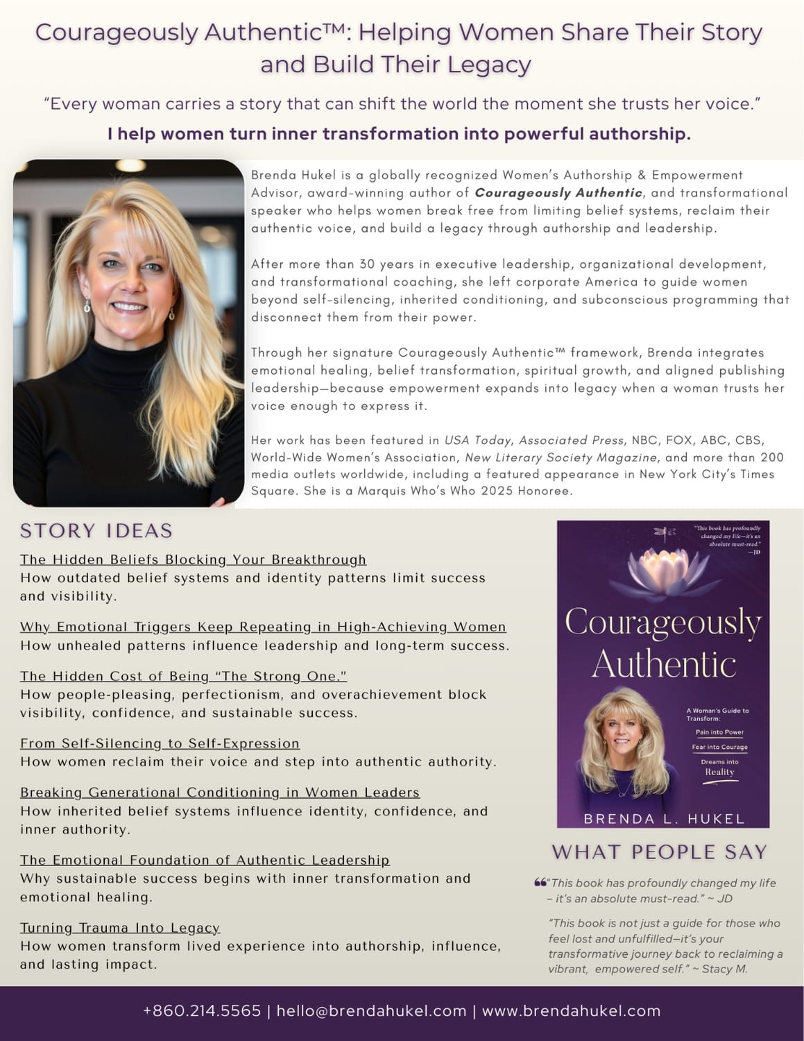 Her work has been featured in USA Today, Associated Press, NBC, FOX, ABC, CBS, and more than 200 media outlets worldwide, including a Times Square appearance. Brenda is widely known for guiding women who feel called to write a book drawn from lived experience and personal truth.